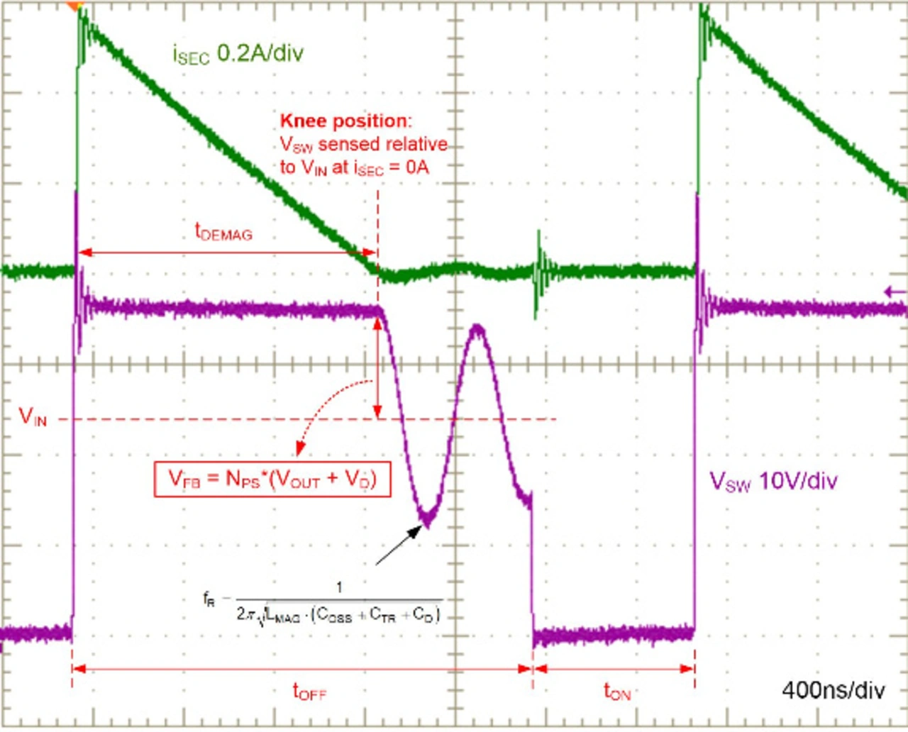 In Bild 3 sind die relevanten Signalverläufe während des Betriebs dargestellt. Die Erfassung erfolgt durch Abtasten und Halten der pegelverschobenen Flyback-Spannung am Knick der Schaltknoten-Spannung, dies entspricht der Lage des Nulldurchgangs des Sekundärstroms. Wenn iSEC am Ende des Entmagnetisierungs-Intervalls auf null zurückgeht (in Bild 3 als „Knee Position“ bezeichnet), gerät VSW in eine Resonanz und klingt gemäß Gleichung 3 als gedämpfte Cosinuswelle ab. Die Dauer der Resonanzperiode richtet sich nach der Induktivität der Magnetisierung und der effektiven Kapazität am Schaltknoten, also nach der Summe aus der parasitären Ausgangskapazität des Schalters, der Wicklungskapazität des Übertragers und der reflektierten Kapazität der Diodensperrschicht.