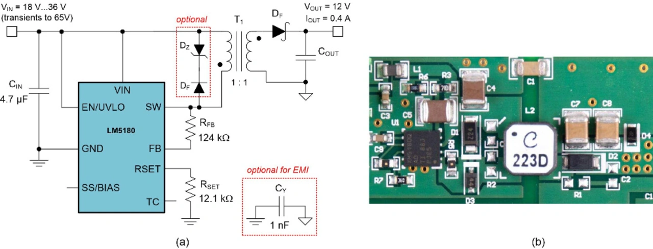 Bild 4a zeigt eine für den SPS-Einsatz geeignete Schaltung mit dem LM5180 von Texas Instruments. Es handelt sich um einen PSR-Sperrwandler ohne Hilfswicklung, mit integriertem Leistungsschalter und Regelkreis-Kompensation [4]. Die Z-Dioden-Klemmschaltung parallel zur Primärwicklung ist je nach der Streuinduktivität optional. Gleiches gilt für den Y-Kondensator zwischen primärseitiger und sekundärseitiger Masse, der zur Verringerung der Gleichtaktstörungen dient. Das Foto in Bild 4b zeigt eine Implementierung [7] mit einer handelsüblichen gekoppelten Induktivität und einem Windungsverhältnis von eins. Diese gekoppelte Induktivität weist eine Magnetisierungs-Induktivität von 22 µH und eine Streuinduktivität von 150 nH auf und misst nur 6 x 6 mm bei einer Höhe von 3,5 mm.