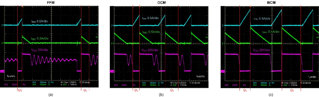 Bild 6 gibt die typischen Schaltspannungen und Ströme für die einzelnen Betriebsarten FFM, DCM und BCM wieder. Darin stehen D1 und D2 für die Leitintervalle des Schalters bzw. der Diode.