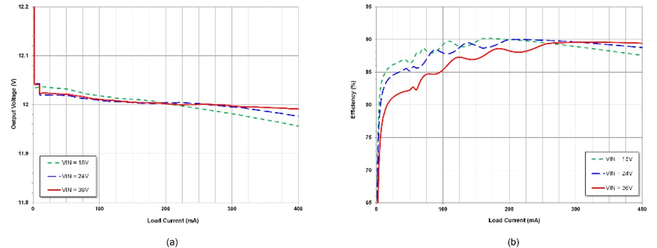 Aus Bild 7 schließlich gehen die Lastregelungs- und Wirkungsgradeigenschaften bei verschiedenen Eingangsspannungen und einer Nenn-Ausgangsspannung von 12 V hervor. Wie man sieht, wird eine Lastausregelung über 1 % erreicht.