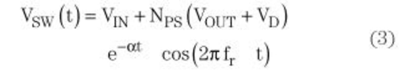 Gleichung 2 liefert eine Aussage über die Höhe der Schaltknoten-Spannung am Ende der Leitphase der Diode, wenn der Sekundärstrom auf null zurückgeht. NPS ist das Windungsverhältnis zwischen Primär- und Sekundärseite, und VD steht für den Spannungsabfall an der Diode bei einem Strom von nahezu null. Die Ausgangsspannung lässt sich präzise ermitteln, da die Diodenspannung lediglich einen statischen Fehler hervorruft, der sich durch eine geeignete Abstimmung leicht eliminieren lässt.