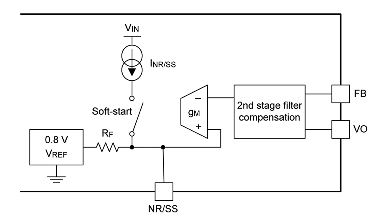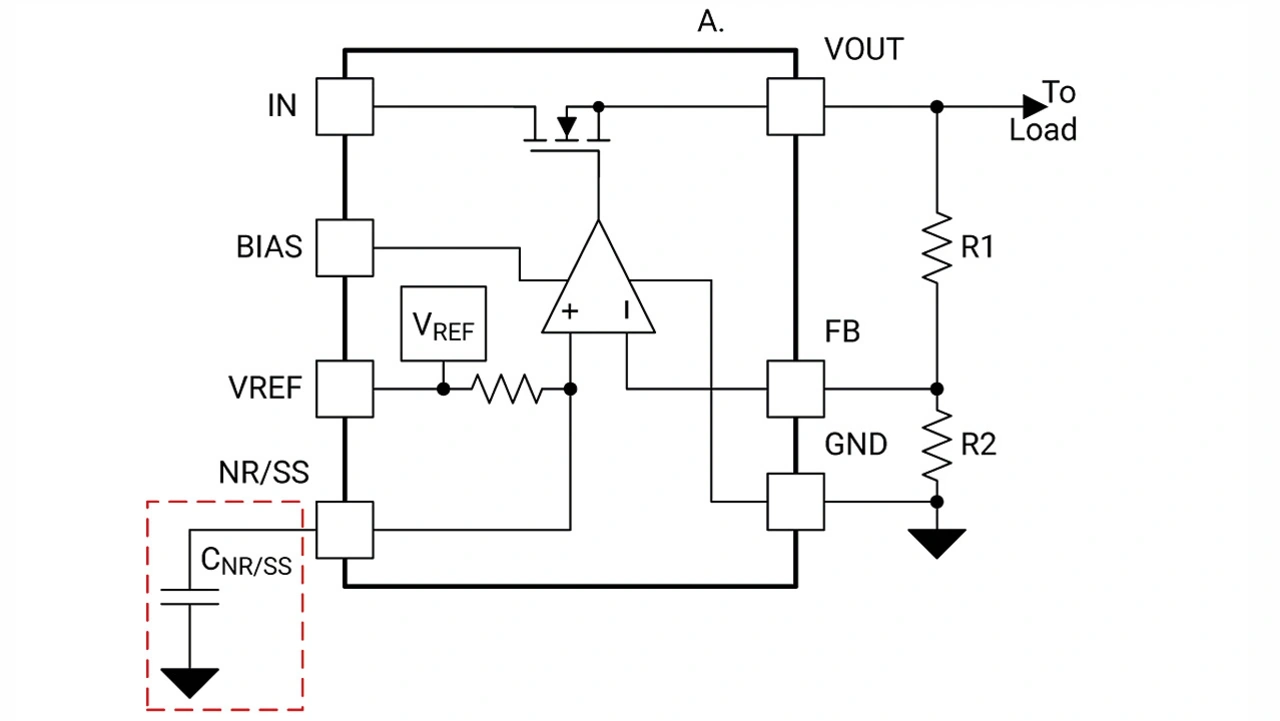 Die größte interne Rauschquelle bei einem LDO ist die eingebaute Spannungsreferenz. Um Abhilfe schaffen zu können, sind verschiedene LDOs im Portfolio von TI mit einem NR-Pin (Noise Reduction) ausgestattet. Ein daran angeschlossener Kondensator (CNR/SS) ergibt zusammen mit dem internen Widerstand am VREF-Anschluss einen RC-Filter (Bild 4).