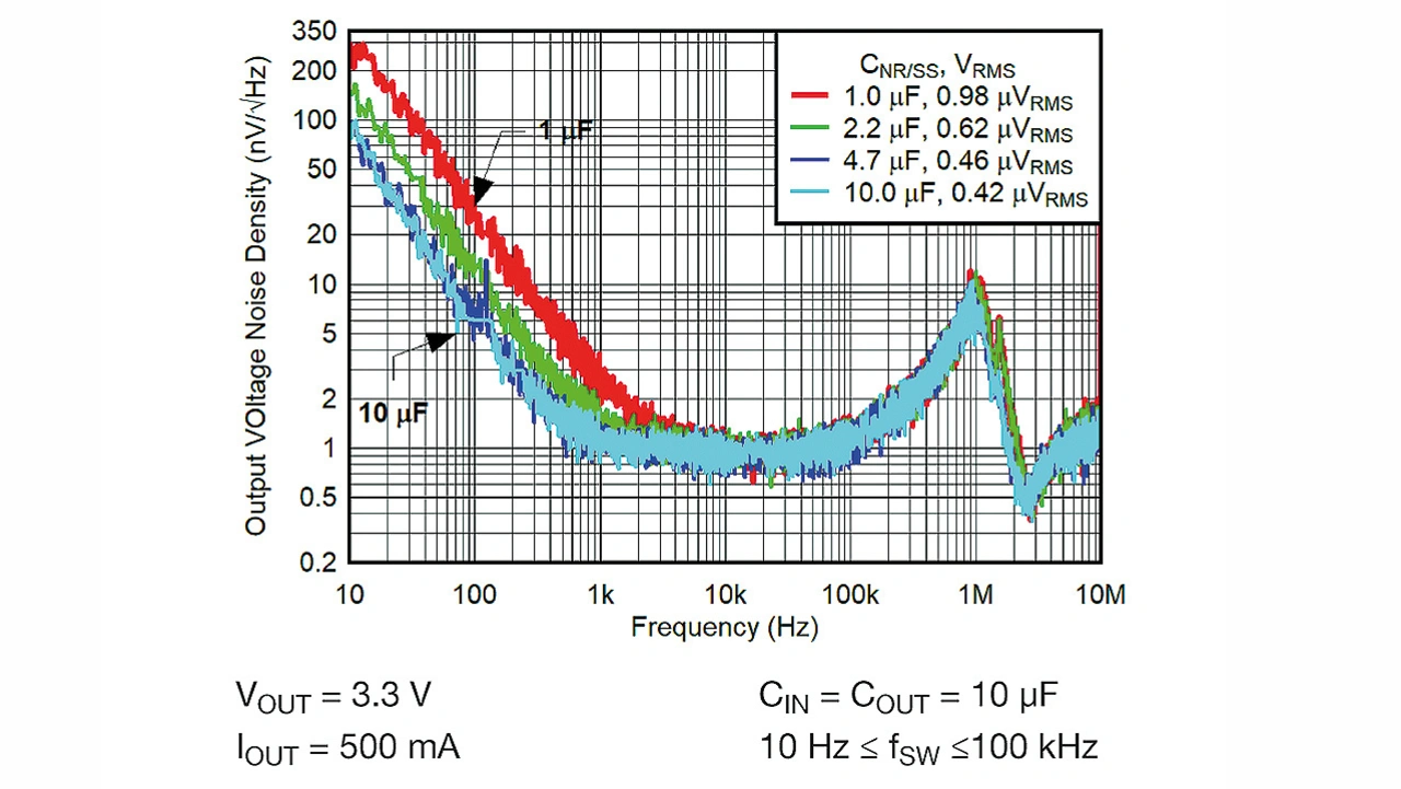 Neuere LDOs enthaltenen eine hochpräzise, rauscharme Stromquelle, gefolgt von einem Fehlerverstärker. Eine Konfiguration mit Eins-Verstärkung sorgt für geringes Rauschen über den gesamten Ausgangsbereich. Der auf diesem Prinzip basierende TPS7A94 etwa kommt im Bereich von 10 Hz bis 100 kHz auf ein Rauschen von 0,46 µV RMS. Bild 5 zeigt für diesen Baustein die Rauschdichte am Ausgang, und es ist deutlich zu sehen, welche Auswirkungen es hat, wenn der Kapazitätswert von CNR/SS von 1 µF auf 10 µF angehoben wird.