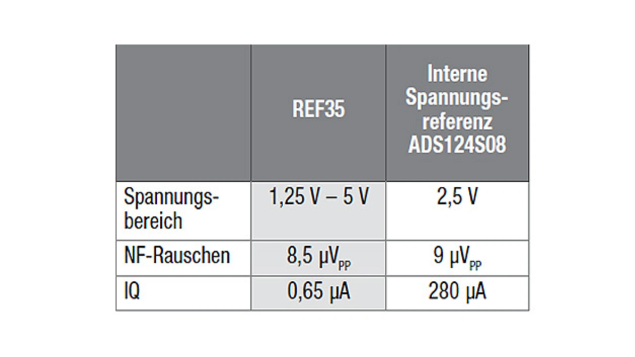Zwar lässt sich das Rauschen verringern, wenn man eine höhere Stromaufnahme in Kauf nimmt, aber in portablen medizinischen Geräten oder Edge-Systemen existiert oftmals ein vorgegebenes Leistungsbudget, das nicht überschritten werden darf. In solch einem Fall empfehlen sich beispielsweise die 24-bit-ADCs der ADS124S08-Familie von Texas Instruments mit einer Stromaufnahme von nur 280 µA. Die Tabelle zeigt einen Vergleich der Eigenschaften der internen Spannungsreferenz dieses ADC mit der Spannungsreferenz REF35, deren geringes Rauschen und hohe Genauigkeit die Verstärkungs- und Quantisierungsfehler reduzieren, während das System insgesamt auch weniger Strom aufnimmt.