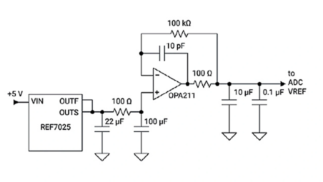 Hochauflösende ADCs sind besonders empfindlich gegenüber Rauschen aus der Spannungsreferenz, das sich direkt auf die Spannungsmessungen auswirkt. Erst mit extrem rauscharmen Spannungsreferenzen können ADCs ihr Auflösungspotenzial vollständig ausschöpfen. Die Spannungsreferenz REF70 mit ihrem äußerst geringen 1/f-Rauschen etwa lässt sich zusätzlich durch Tiefpassfilter am Ausgang ergänzen, um das Systemrauschen weiter abzusenken (Bild 2).