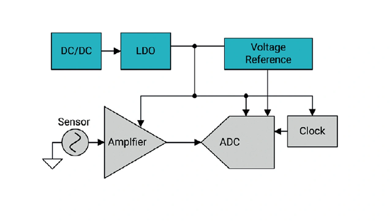 In Signalketten reizt man die technischen Möglichkeiten hinsichtlich Auflösung und Genauigkeit immer weiter aus, weshalb das Rauschniveau möglichst niedrig gehalten werden muss. Hierfür wiederum müssen neben den Signalkettenbausteinen wie Analog-Digital-Umsetzern (ADCs) oder Verstärkern auch Stromversorgungs-Bauelemente wie etwa Schaltregler und Low-Drop-Out-Regler (LDOs) in den Fokus rücken. Im Zentrum der in Bild 1 gezeigten typischen Signalkette steht ein ADC, der eine externe Spannungsreferenz, eine Taktquelle und eine Signalaufbereitungsschaltung benötigt. Dargestellt sind darüber hinaus auch ein DC/DC-Wandler und ein LDO, die die Stromversorgung der Signalkette übernehmen.