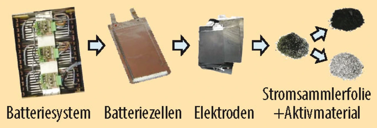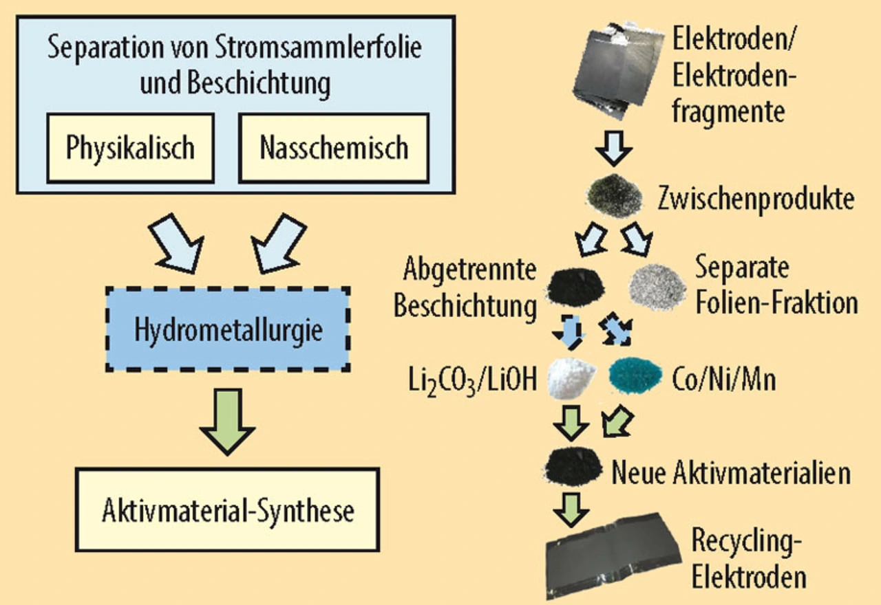 Die Elektroden setzen sich aus den Anoden- und Kathodenverbünden zusammen. Sie bestehen zu 15 % aus Kupferfolie und 31 % aus der organischen Beschichtung der Anode (Graphite und Ruße) sowie zu 8 % aus der Aluminumfolie und den 46 % aus der Aktivmaterial-Beschichtung der Kathode. Zur weiteren hydrometallurgischen Aufarbeitung des Aktivmaterials müssen diese Verbünde voneinander getrennt werden (Bild 4). Zur Elektrodenseparation wurden zwei alternative oder kombinierbare Prozesse entwickelt: Einerseits ein nasschemischer Prozess und andererseits ein mechanischer Prozess.