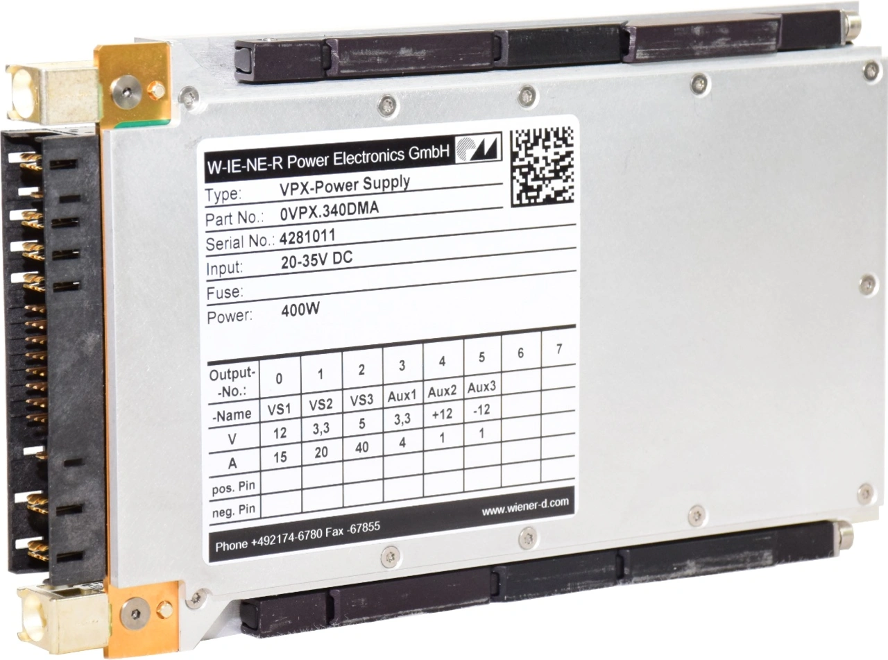 Das VPX-Netzteil für 715W (DC-DC) ist dank sehr hoher Packungsdichte außergewöhnlich leistungsstark. Es wurde nach dem Standard MIL-STD-810 getestet (Altitude, Vibration, Shock) und bestätigt damit seine Eignung für sehr raue Einsatzbedingungen. Das Netzteil, das sowohl wärmeleitungs- (D575.00701/VPX371DMA) als auch luftgekühlt (D575.01230/VPX371DAA) lieferbar ist, wird bereits in vielen Applikationen weltweit erfolgreich eingesetzt und lehnt sich an die VITA 62-Norm an. Das DC-DC-Netzteil für 400W D575.00720/VPX340DMA erfüllt sowohl VITA 62 als auch die relevanten Militär-Normen und ist mit 90% Wirkungsgrad sehr effizient. Dieses für den militärischen Flugbetrieb geeignete Netzteil überzeugt mit diskretem Aufbau, was optional kundenspezifische Anpassungen erlaubt. Besonders variabel präsentiert sich das konstruktiv ähnliche Netzteil D575.00730/VPX336DM, das vier verschiedene Ausgangskonfigurationen mit einer Ausgangsleistung von 360W abdeckt und einen Eingangsspannungsbereich von 15V bis 40V erlaubt. Optional sind auch hier kundenspezifische Anpassungen möglich.