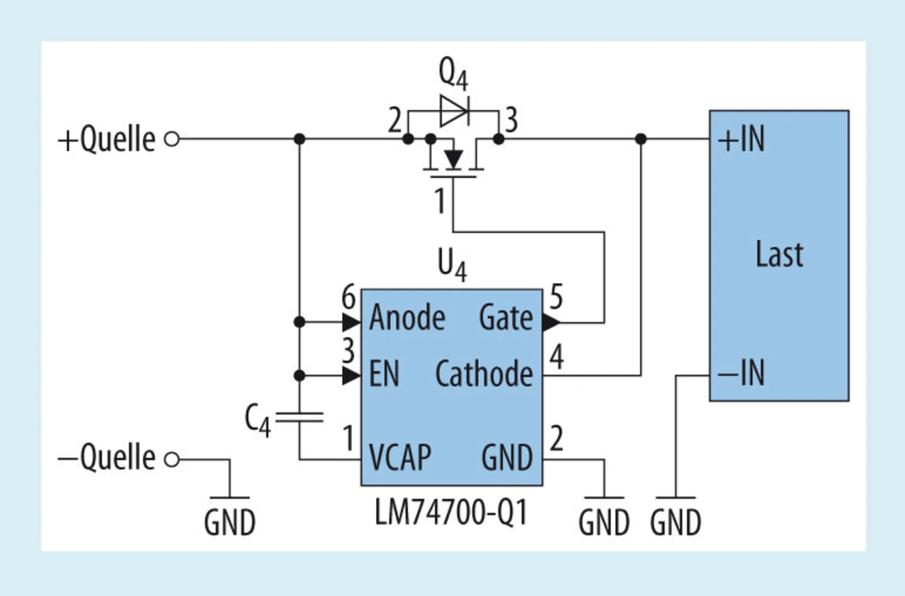 Von Texas Instruments gibt es beispielsweise den für Automotive-Anwendungen qualifizierten LM74700-Q1. Eine bestimmte Funktion ist allen Reglern dieses Typs gemeinsam. Es handelt sich um eine eingebaute Ladungspumpe. Mithilfe eines externen Kondensators (C4) erzeugt die Ladungspumpe zum Ansteuern des FET eine Spannung, die größer ist als die Eingangsspannung. Eine solche Schaltung ist eine kleine und einfache Lösung, da diverse Leistungsmerkmale bereits in den IC integriert sind.