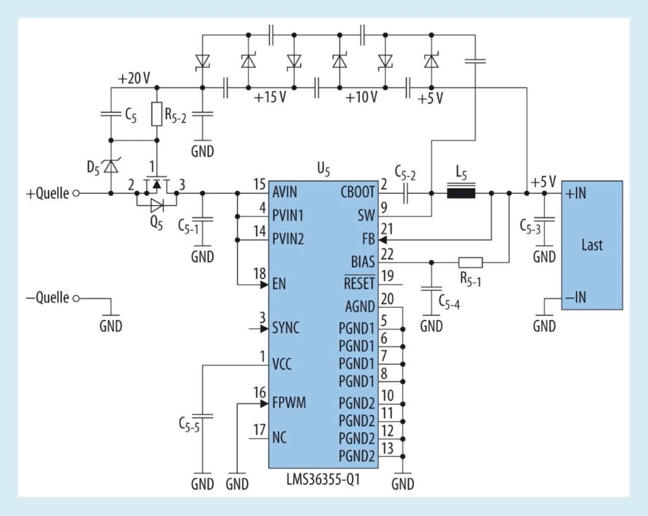 In Bild 5 ist ein synchroner Abwärtswandler des Typs LMS36355-Q1 mit einer fest eingestellten Ausgangsspannung von 5 V zu sehen, wie sie in der Stromversorgungs-Struktur von Kraftfahrzeugen häufig benötigt wird. Der Baustein ist in der Regel ständig mit dem Bordnetz verbunden und versorgt einige Verbraucher, die ständig verfügbar sein müssen.