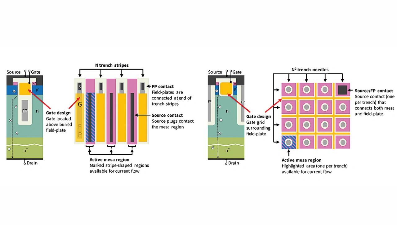 Üblicherweise kombinieren diese Bauelementstrukturen eine isolierte Feldplatte in einem tiefen Trench, welche von der darüber liegenden Gate-Elektrode getrennt ist, mit einem Streifen-Layout (Bild 1, links). In der neuesten Generation dagegen wird der Feldplatten-Trench, der jetzt eine nadelförmige Struktur bildet, vom Gate Trench getrennt. Dieser bildet nun ein Gitter, welches die Nadeln umgibt (Bild 1, rechts). Auf diese Weise kann die für die Stromleitung verfügbare Siliziumfläche vergrößert und der Gesamtwiderstand im eingeschalteten Zustand erneut verringert werden.
