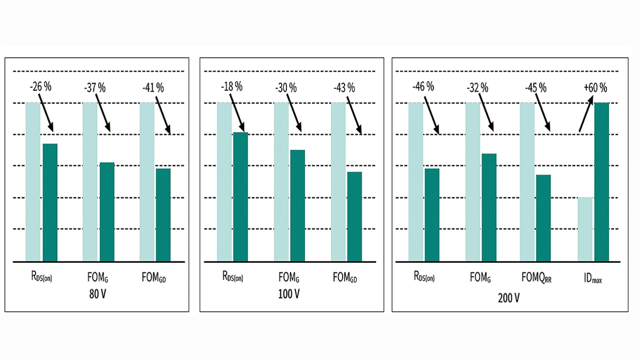 Bild 2 gibt einen Überblick über die Verbesserung der Bauteilparameter für verschiedene Spannungsklassen gegenüber der Vorgängertechnologie. Mit der Reduktion der FOMG verbessert sich die Effizienz insbesondere bei geringer Last, da hier die Ansteuerverluste reduziert werden. Dies ist insbesondere für Schaltnetzteile mit hohen Schaltfrequenzen, aber auch bei Motorantrieben mit vielen parallel geschalteten MOSFETs von Vorteil.