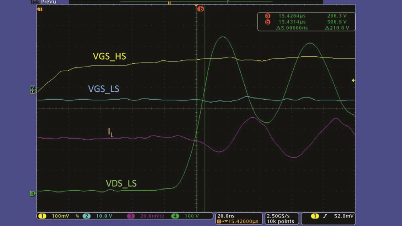 Bild 2 zeigt einen Doppelpuls des Gate-Treibers CMT-TIT8243 und des Moduls CAS300M12BM2 bei 250 A/600 V. Bild 3 zeigt das Einschalten des High-Side-Schalters mit einem du/dt von über 40 kV/µs und sauberen Gate-Signalen.