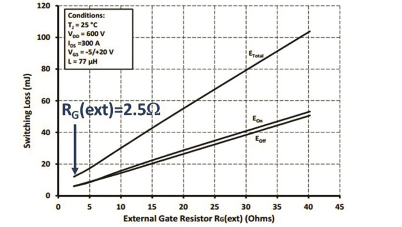 SiC-MOSFETs können schnell schalten, weswegen die Flankensteilheit (du/dt) sehr hoch und damit die Schaltverluste niedrig sind. Bei einem bestimmten Baustein lassen sich die Schaltverluste durch kleinere externe Gate-Widerstände reduzieren (Bild 1). Dadurch erhöht sich der Spitzen-Gate-Strom und das du/dt. Ein Gate-Treiber muss daher in der Lage sein, einen solch hohen Spitzen-Gate-Strom zu liefern, um niedrige Schaltverluste zu ermöglichen.
