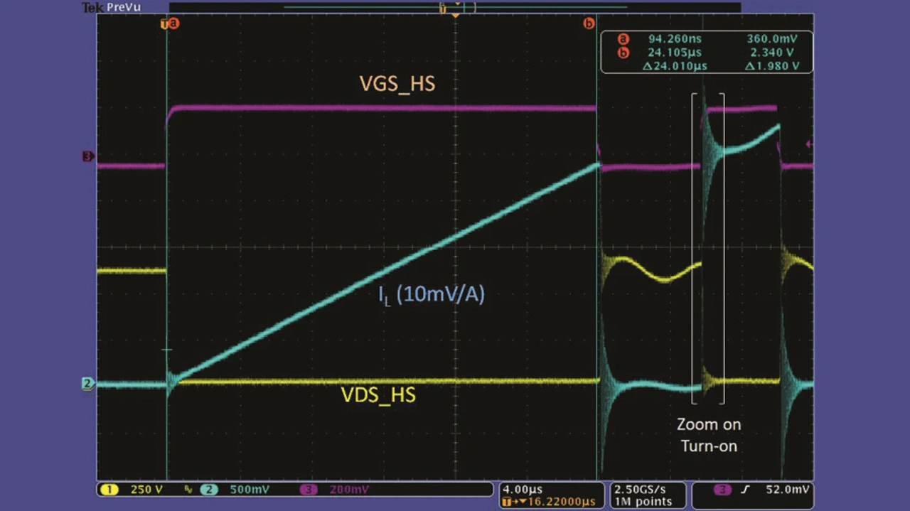 Bild 2 zeigt einen Doppelpuls des Gate-Treibers CMT-TIT8243 und des Moduls CAS300M12BM2 bei 250 A/600 V. Bild 3 zeigt das Einschalten des High-Side-Schalters mit einem du/dt von über 40 kV/µs und sauberen Gate-Signalen.