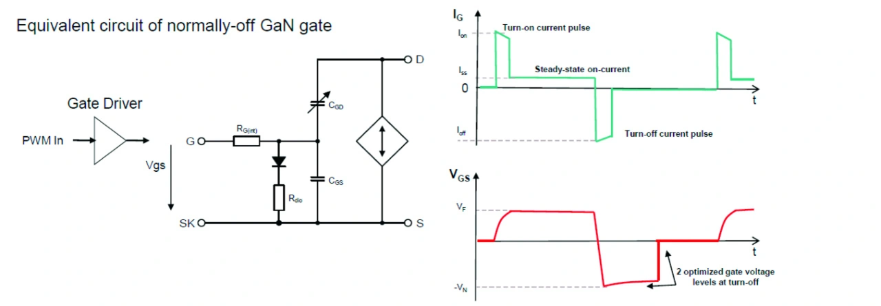 E-Mode-GaN-HEMTs wie die CoolGaN-Familie von Infineon haben eine niedrige Schwellenspannung – 1,2 V typisch –, und der Spitzenstrom zur Gate-Ansteuerung beträgt bei einer Ansteuerspannung von 8 V weniger als 1 A. Um das Bauteil im Durchlasszustand zu halten, ist ein dauernder Strom von 5 mA bis 10 mA erforderlich. Bei einer negativen Gate-Source-Spannung sperrt ein HEMT mit einer Stromspitze aus dem Gate. Anschließend geht die Spannung nach 0 V und wird nach einem langen Intervall negativ, um den gesperrten Zustand zu halten (Bild 2).