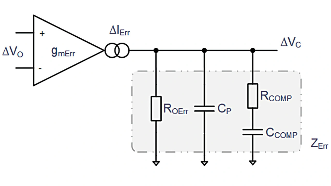Um das Verhalten bei Transienten zu optimieren, muss man für ein stabiles Verhalten bei herkömmlichen Schaltreglern einen Kompromiss aus Verstärkungsfaktor und Grenzfrequenz finden. Dabei spielt die Kombination aus dem Übertragungsverhalten der Leistungsstufe und des Fehlerverstärkers eine wichtige Rolle. Betrachten wir zunächst das Blockschaltbild und die Übertragungsfunktion des Fehlerverstärkers eines konventionellen Schaltreglers (Bild 1).