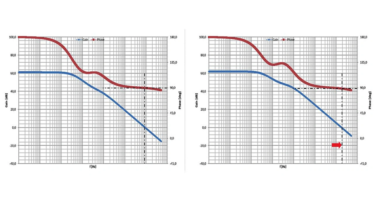 Betrachten wir nun, wie sich verändernde Ausgangskapazitäten auf die Schaltung auswirken. In dem nun folgenden Beispiel wird der Standardwert von 44 µF auf 22 µF halbiert. Wie man in den Bode-Diagrammen in Bild 4 erkennen kann, verschiebt sich die Durchtrittsfrequenz hierdurch zu höheren Werten. Dadurch ändert sich die Phasenreserve, das Maß der Stabilität eines Spannungsreglers. Die Phasenreserve lässt sich in den Diagrammen an den Schnittpunkten der Senkrechten der Durchtrittsfrequenz mit dem Phasengang ablesen.