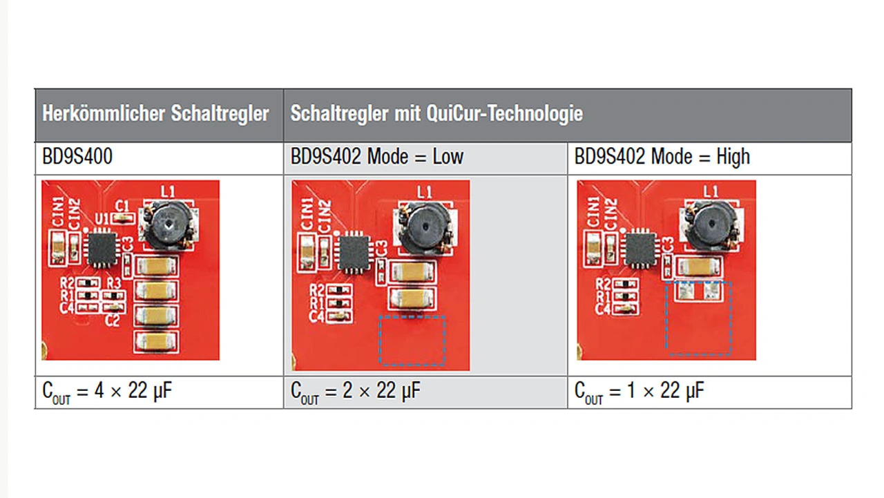 Mit QuiCur (Quick Current) hat Rohm eine Stromversorgungstechnologie entwickelt, die bei DC-DC-Wandler-ICs (Schaltregler) und LDOs (Linearregler) die Ausgangsspannungen bei Transienten (Lastwechsel) in Bezug auf Reaktionsgeschwindigkeit und Stabilität verbessert. Durch Integration von QuiCur lässt sich die Spannungsversorgung optimieren, ohne dass der Fehlerverstärker und damit die gesamte Schaltung instabil werden. Kleinere Kapazitätswerte für die Ausgangskondensatoren reduzierten nicht nur die Anzahl der nötigen externen Bauteile und die dafür notwendige Montagefläche, sondern Anwender können auch die durch die Transienten hervorgerufenen Schwankungen der Ausgangsspannung (negative konstante proportionale Beziehung) anpassen.