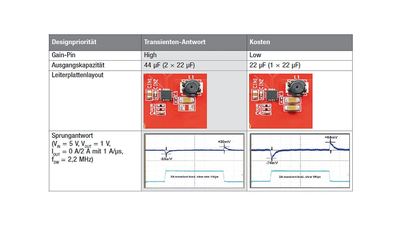 Um dies zu gewährleisten, überwacht ein Stromversorgungs-IC ständig die Ausgangsspannung und gleicht diese über einen Fehlerverstärker mit einer internen Referenzspannung ab. Durch kürzere Reaktionszeiten lassen sich Änderungen der Ausgangsspannung, verursacht durch Schwankungen der Eingangsspannung und/oder des Laststroms, schneller ausregeln. Wird die Ansprechzeit andererseits zu stark verkürzt, wird die Schaltung instabil und die Ausgangsspannung beginnt zu schwingen. Da die Ausgangskapazität auch die Ansprechgeschwindigkeit beeinflusst, war es bishe schwierig, das gewünschte Ansprechverhalten zu erreichen.