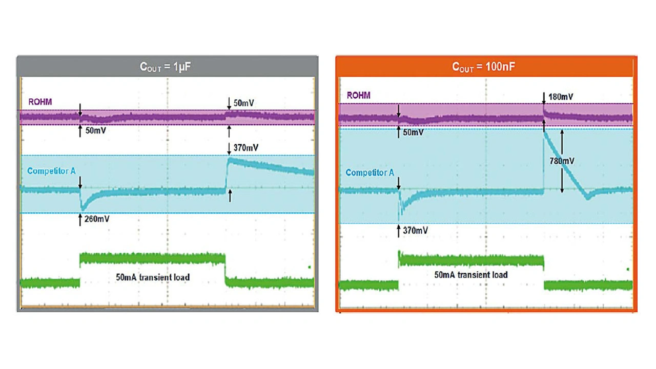 Im Jahr 2020 hat Rohm die Nano-Cap-Technologie für LDOs (Low Drop-Out) entwickelt. Gegenüber herkömmlichen LDOs nutzt diese Technologie auch Informationen über den Laststrom, um die Ausgangsspannung präzise zu regeln. Kombiniert man Nano Cap und QuiCur lässt sich der Wert des Ausgangskondensators deutlich reduzieren und gleichzeitig das Verhalten bei Transienten signifikant verbessern. Die Ausgangskapazität kann so auf weniger als ein Zehntel der herkömmlichen Lösungen reduziert werden. Im Ideal- fall ist es sogar möglich, den Ausgangskondensator gänzlich wegfallen zu lassen, und anstelle dessen den Eingangskondensator an der Last – typischerweise 100 nF – nutzen, um die Spannung zu stabilisieren.