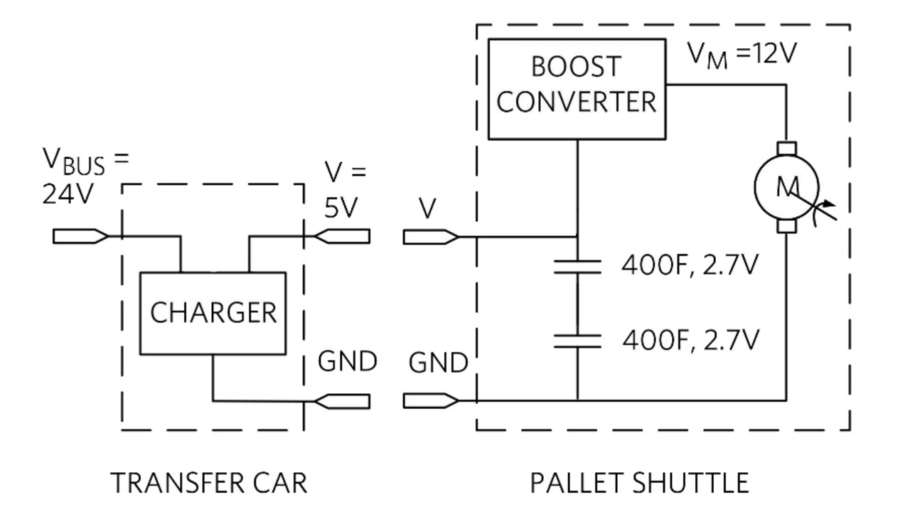 Bild 1 zeigt das Stromversorgungssystem auf der Basis von zwei in Reihe geschalteten Superkondensatoren mit jeweils 400 F und 2,7 V. Diese befinden sich an Bord des Paletten-Shuttles, während sich das Ladegerät an Bord des Transferwagens befindet. Das Ladegerät bezieht seine Leistung aus der Bus-Spannung VBUS von 24V. Während der Andockzeit zwischen den Shuttle-Fahrten lädt es das die beiden Superkondensatoren, die in der Reihenschaltung eine Gesamtkapazität von 200 F haben, mit 5 V auf. Damit beträgt die gespeicherte Ladung Q 1000 C (200 F × 5 V). Bei einem Ladestrom von 20 A sind die Superkondensatoren in 50 s (1000 C/20 A) vollgeladen.