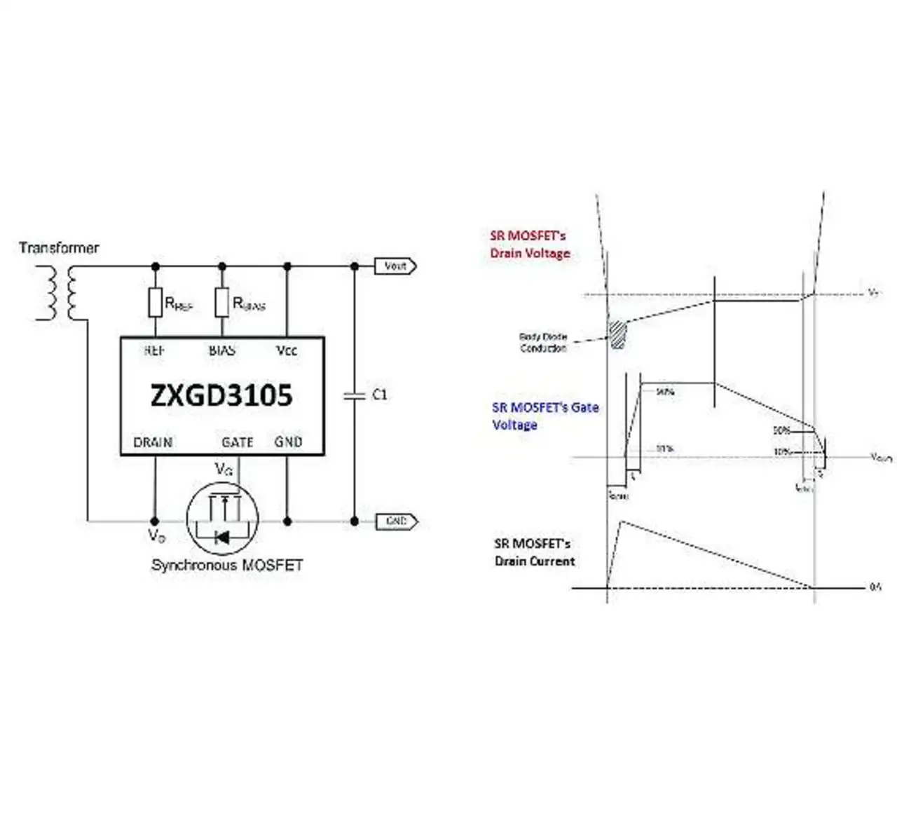 Bei dem hier beschriebenen »ZXGD3105« handelt es sich um ein synchrones Controller-IC für die Sekundärseite, das sehr eng am MOSFET arbeitet, der die herkömmliche Schottky-Diode ersetzt. Das IC misst den Strom mit Hilfe des Spannungsabfalls zwischen den Drain- und Source-Anschlüssen des MOSFETs. Genau genommen erkennt es den Abfall der Vorwärtsspannung der parasitären Diode innerhalb des MOSFETs.