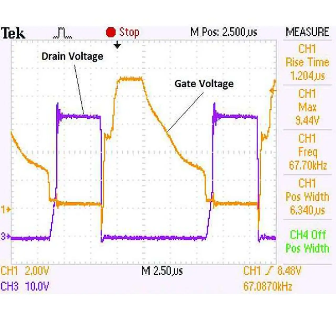 Bild 3 zeigt, wie der Controller die Gate-Spannung schnell ansteigen lässt, wenn der Drain-Strom sein Maximum erreicht; dies unterstützt den MOSFET optimal dabei, seinen On-Widerstand so klein wie möglich zu halten, solange ein Strom in signifikanter Höhe fließt. Während der Sperrstrom des Transformators durch den MOSFET abnimmt, senkt der ZXGD3105 die Ansteuerspannung des MOSFET-Gates ab.