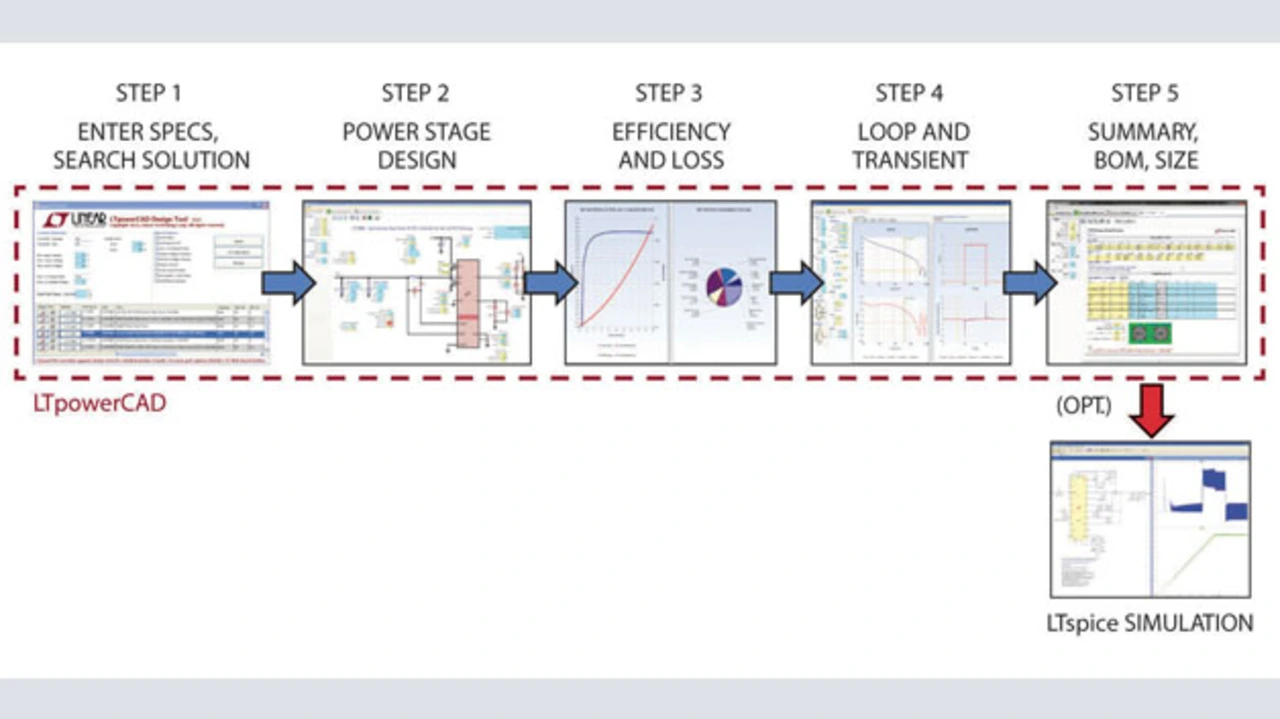 Um dem Anwender Zeit und Aufwand zu ersparen und dennoch eine qualitativ hochwertige Lösung zu erreichen, hat Linear Technology das Entwicklungswerkzeug "LTpowerCAD" geschaffen. Dieses bietet einen systematischen Weg, um die Schlüsselparameter einer Stromversorgung in fünf Schritten festzulegen (Bild 1):