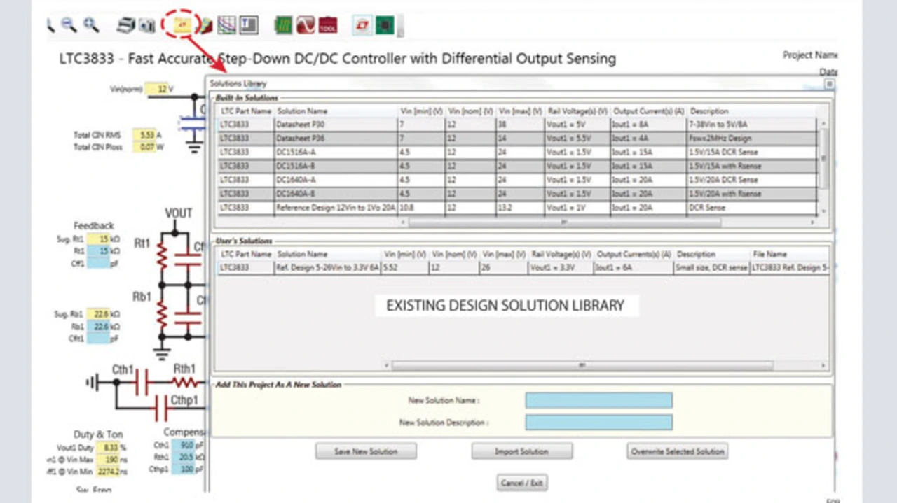 Die Bibliothek mit LTpowerCAD-Designlösungen ist ein wichtiger Bestandteil, der dem Anwender helfen soll, schnell und mit guten Ergebnissen zu einem finalen Design zu gelangen. Nutzer können durch Klicken auf die Schaltfläche "Solutions Library" viele bestehende Designs für bestimmte Produkte von Linear Technology finden (Bild 8). Diese Entwicklungen können Standard-Demoboards von Linear Technology, Datenblattschaltungen und Referenzdesigns sein. Viele davon sind im Labor getestet und verifiziert, sodass der Anwender eine neue Entwicklung mit einem der vorhandenen erprobten Beispiele beginnen kann. Darüber hinaus können die Nutzer ihre Designs abspeichern und eine Bibliothek mit Anwenderlösungen für den künftigen Gebrauch aufbauen.