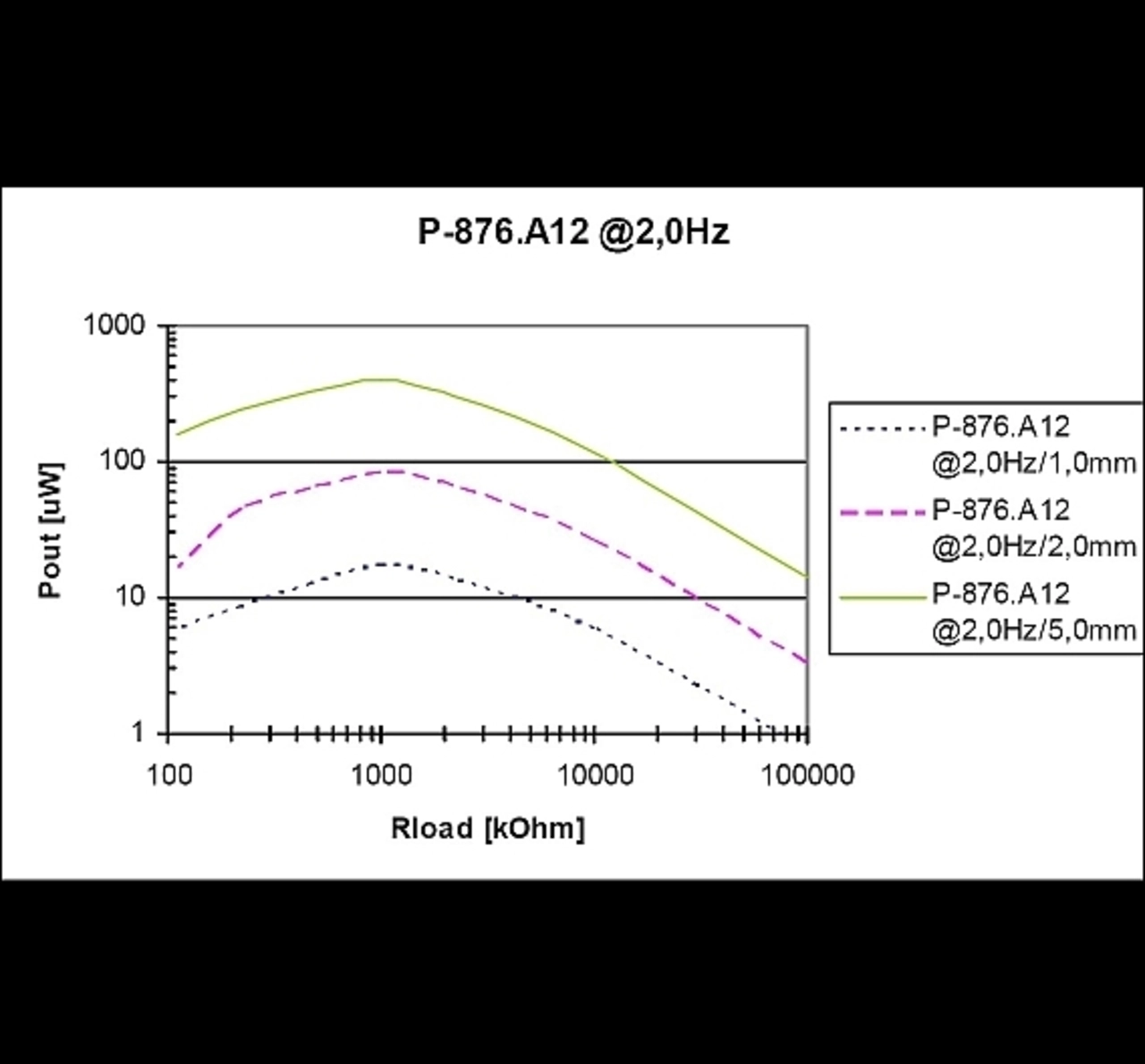 Dabei zeigte sich, dass jeder Testwandler einen unterschiedlichen elektrischen Lastbereich mit optimaler Leistungsabgabe hat. Die Biegerstruktur mit dem DuraAct P-876.A12 liefert unter den genannten Randbedingungen die größte Ausgangsleistung. Daran erkannt man sehr gut, dass für eine optimale Leistungsabgabe immer ein optimiertes Wandlerdesign mit entsprechender Leistungsanpassung notwendig ist.
