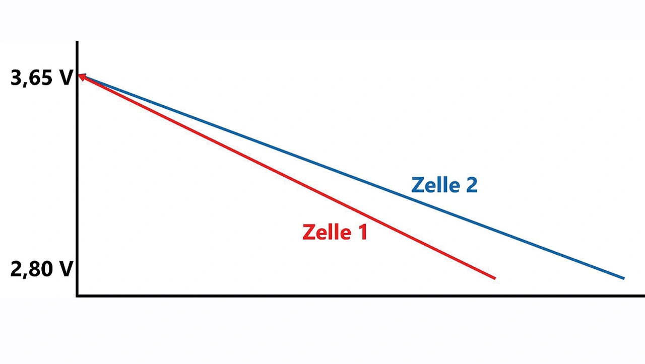 Im ersten Beispiel verfügt Zelle 1 über etwas weniger Kapazität als Zelle 2, sie ist früher entladen, erreicht also früher die Entladeschluss-Spannung. Zelle 2 hat eine höhere Kapazität, sie gibt über eine längere Zeit Energie ab und ihre Spannung ist höher, wenn Zelle 1 entladen ist. Das lässt sich im Schaubild daran erkennen, dass die Pfeile nicht parallel verlaufen: Der Pfeil, der Zelle 1 repräsentiert, ist kürzer (Bild 1).