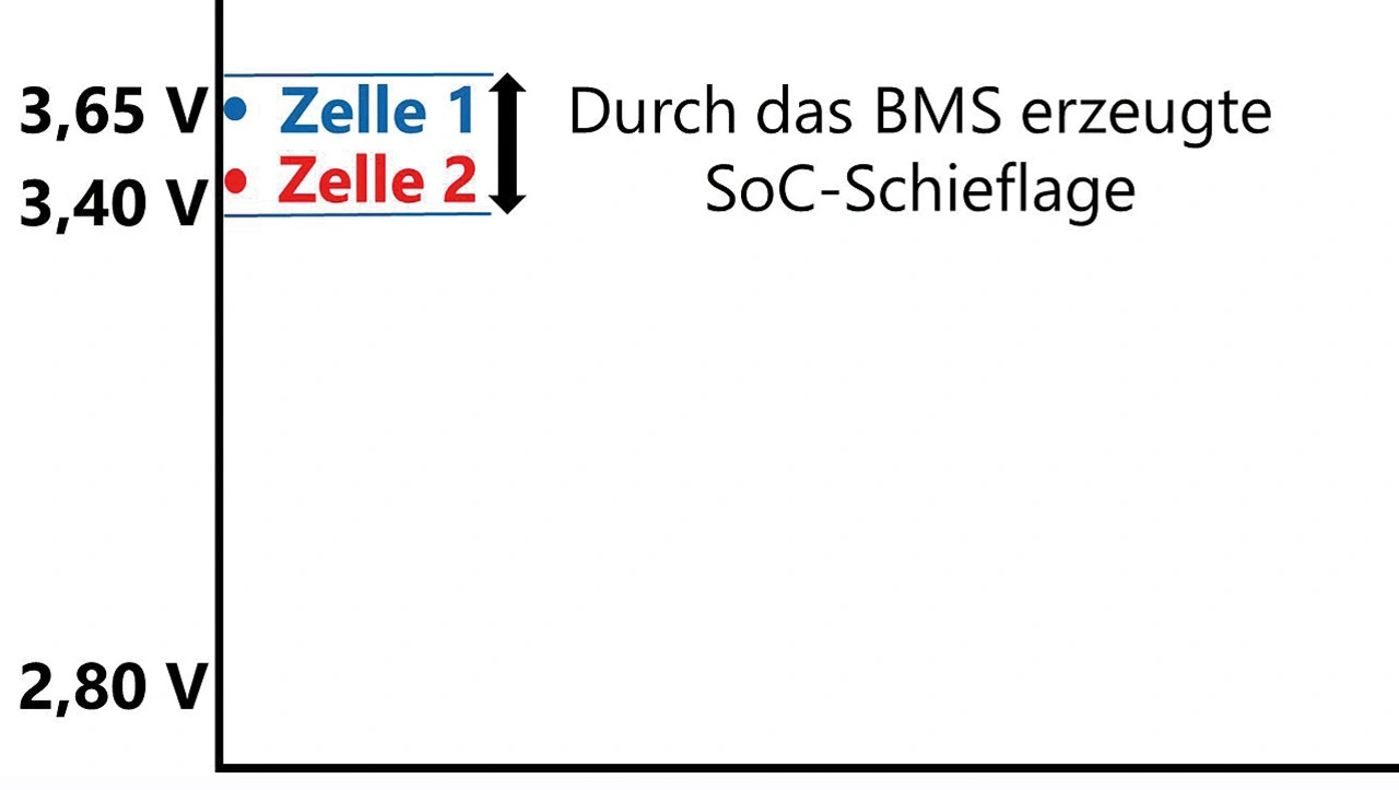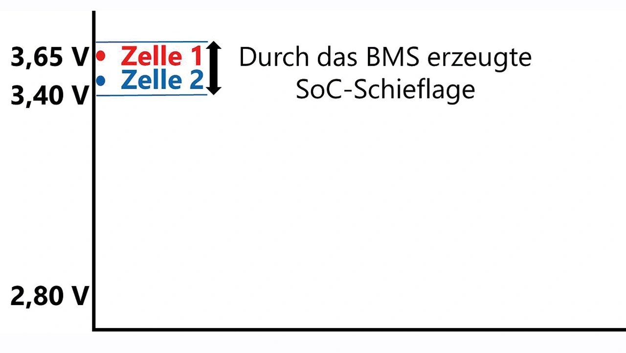 Das herkömmliche BMS beginnt also, für Zelle 1 Widerstände zu schalten. Das ist fatal, denn in dieser Zelle wird ohnehin bereits mehr Ladestrom in Wärme umgewandelt. Am Ende des Ladevorgangs ist Zelle 1 somit weniger geladen als Zelle 2 (Bild 5). Der Eingriff des BMS hat dazu geführt, dass die falsche Zelle während des Ladevorgangs gebremst wurde. Auch das führt über längere Zeit zu deutlichen SoC-Schieflagen und verschlechtert den Systemwirkungsgrad.