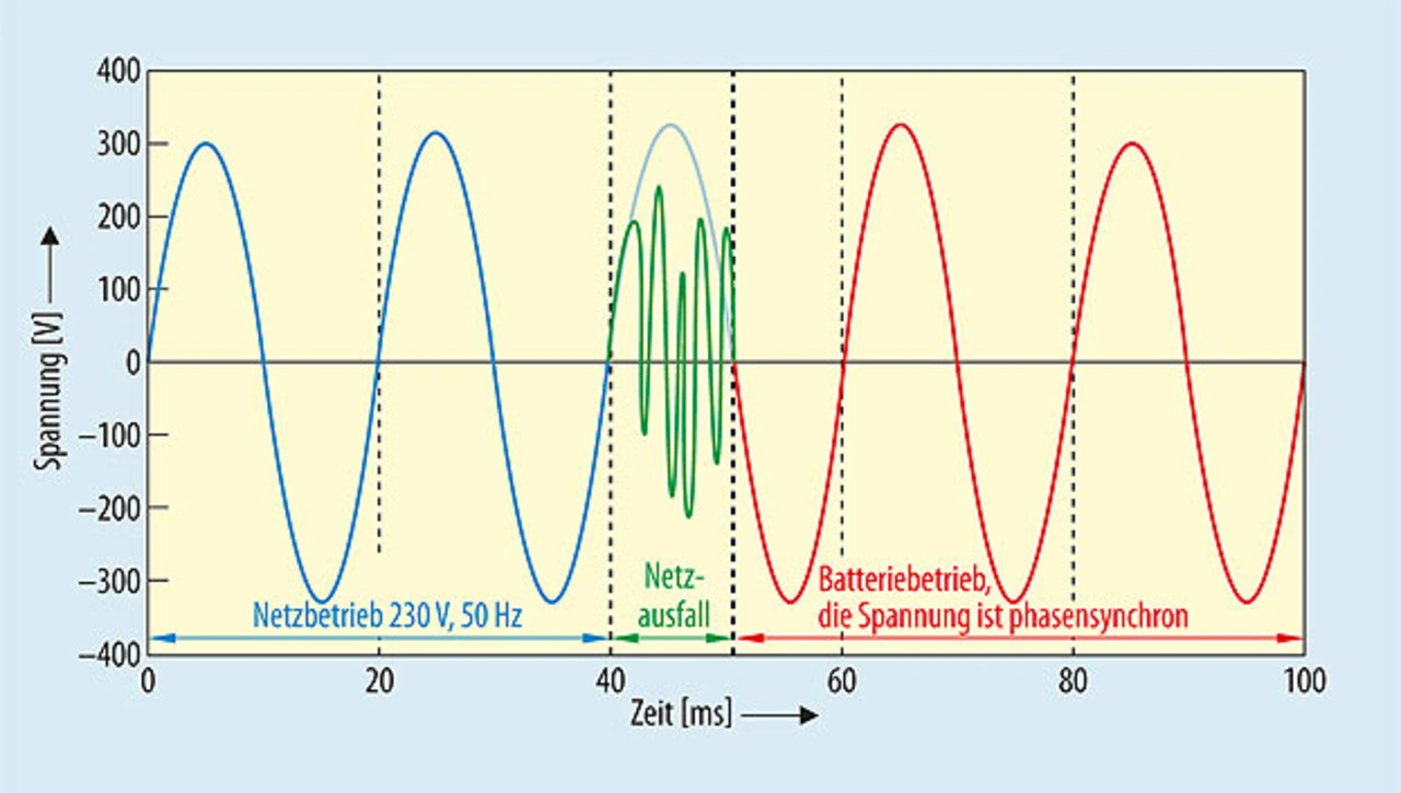 Während des regulären Netzbetriebs werden die Batterien der USV überwacht und geladen, um für den Netzausfall vorbereitet zu sein. Fällt die Netzversorgung aus, schaltet die Trio USV vom Netzbetrieb auf Batterieversorgung um: Dann wird die Last, etwa ein Industrie-PC, aus der Batterie über einen Wechselrichter versorgt. Dabei ist es für die sensible Elektronik von Industrie-PC und Co. wichtig, dass das USV-Modul nahezu unterbrechungsfrei und phasenrichtig in einer echten Sinuskurve umschaltet. Hier bieten vergleichbare Geräte oft nur eine Trapez- oder Rechteckspannung, die die versorgten AC-Verbraucher aus dem Tritt bringen können. Gemäß der Klassifikation für unterbrechungsfreie Stromversorgungen VFD SS311 schaltet die Trio AC USV vom Netzbetrieb mit 230 V und 50 Hz innerhalb von 6 ms auf Batterieversorgung um.