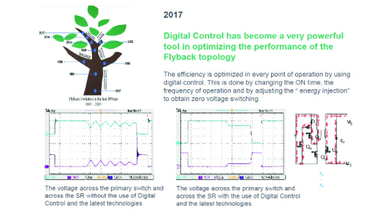 Er wird uns in seinem Beitrag aufzeigen, wie sich die Stromversorgungstopologien über die Jahre entwickelt haben, angefangen 1987 mit einem simplen Sperrwandler mit einem Schalter und einem Trafo, über den Einfluss, den der Superjunction-MOSFET auf die Topologien gehabt hat, bis hin zu den nun aufkommenden Wide-Bandgap-Schaltern, die wieder andere Topologien – sehr häufig einfachere – möglich machen. Die digitale Leistungselektronik ist der Schritt, der gerade vollzogen wird. Das hat zu eher weich schaltenden Topologien geführt, sodass beim Schaltvorgang keine hochfrequenten Oszillationen und in der Totzeit keine niederfrequenten Schwingungen mehr auftreten. In Bezug auf den Wirkungsgrad ist wirklich viel erreicht worden, und das Schaltverhalten ist so, dass es sich im System sehr gut beherrschen lässt. Darüber hinaus bietet die digitale Lösung sehr hohe Flexibilität im System bei gleichzeitig geringerer Zahl an Bauelementen und höherer Zuverlässigkeit – Überspannungen können besser beherrscht werden bei reduziertem Filteraufwand.