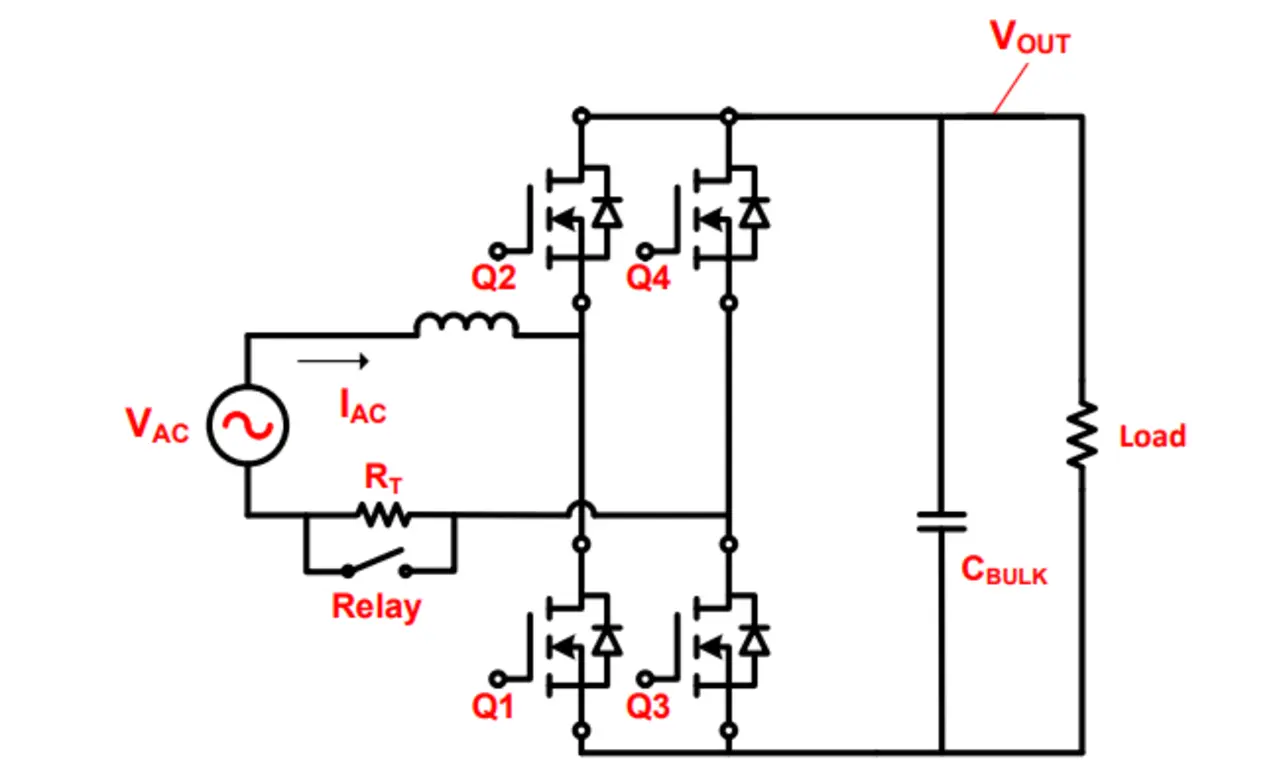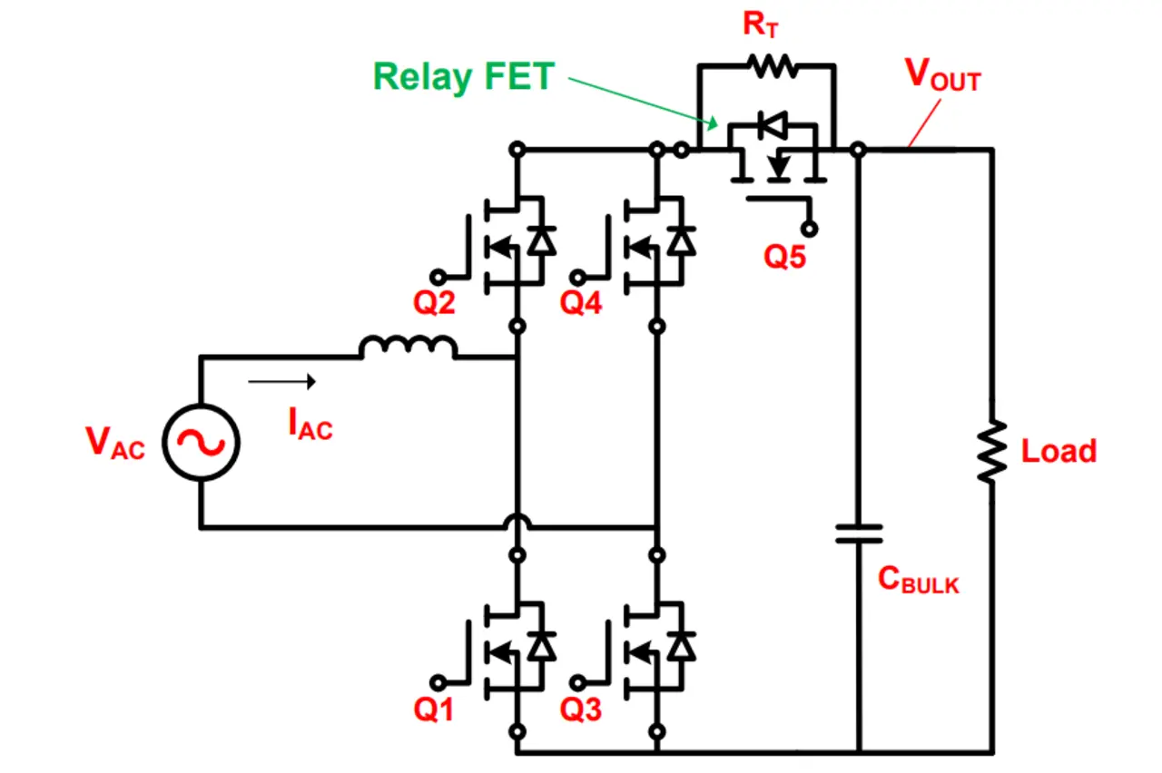Bild 1 zeigt, wie sich der Inrush-Strom begrenzen lässt: auf der Eingangsseite der PFC-Stufe wird ein Thermistor (RT) mit positivem Temperaturkoeffizienten (PTC) und ein elektromechanisches Relais eingesetzt. Beim Hochfahren der PFC-Stufe ist der Relaiskontakt offen, der Inrush-Strom wird durch RT auf einen niedrigen Wert begrenzt und der große Ausgangskondensator (CBULK) der PFC-Stufe langsam aufgeladen. Sobald die Ausgangsspannung (VOUT) den Scheitelwert der Eingangsspannung (VAC) erreicht hat, fällt der Inrush-Strom der PFC-Stufe auf null. Anschließend schließt das Relais, wodurch der RT überbrückt – also elektrisch kurzgeschlossen – wird, um die Verluste im Normalbetrieb zu reduzieren.