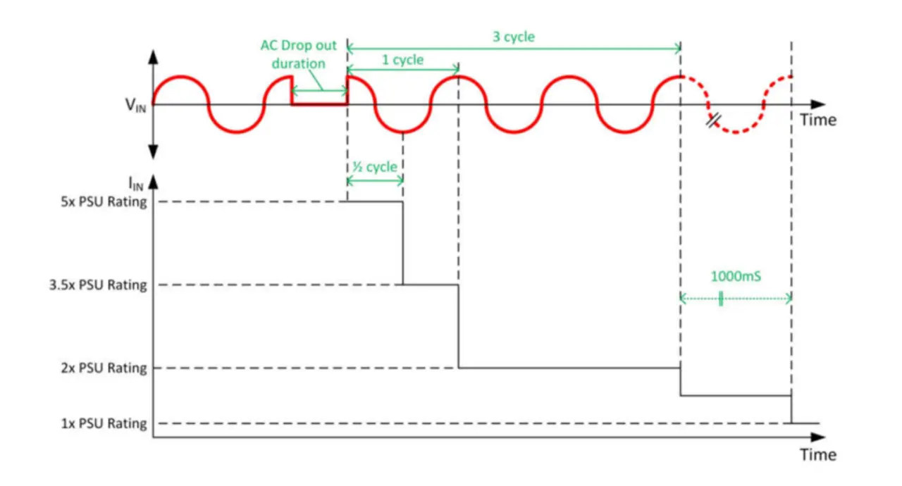 In der Vergangenheit musste dieser Rerush-Strom ausschließlich von den Bauteilen der Leistungsstufe bewältigt werden. Tests haben allerdings gezeigt, dass der Rerush-Strom auf mehr als das Zehnfache des für die PFC spezifizierten maximalen Eingangsstroms ansteigen kann. Ein derart hoher Rerush-Strom kann die Stromversorgung beschädigen oder ihre Lebensdauer verkürzen. Aus diesem Grund begrenzt die M-CRPS-Spezifikation die Höhe des Rerush-Stroms nach der Rückkehr der Netzspannung: Der Effektivwert des Rerush-Stroms muss während einer Halbwelle der Eingangsfrequenz kleiner als das Fünffache des Maximalstroms der Stromversorgung (5 x Irated,RMS) sein und über einen vollen Zyklus hinweg sogar nur weniger als das 3,5-Fache (3,5 x Irated,RMS). Zusätzlich wird gefordert, dass sich der Eingangsstrom nach Rückkehr der Netzwechselspannung innerhalb von zwei Zyklen auf einen Wert von ≤2 x Irated,RMS stabilisiert.