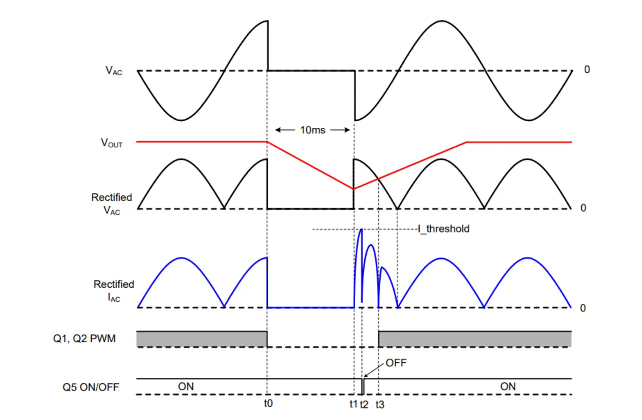 Bei t0: Q1 und Q2 schalten ab, sobald der Abfall von VAC detektiert wird. Gleichzeitig müssen auch die Spannungs- und die Stromregelung der PFC-Stufe abgeschaltet werden, weil deren Integratoren sonst weiter integrieren. Sobald die Netzspannung zurückkehrt und die PFC-Stufe wieder einschaltet, würde dadurch ein zu großes PWM-Tastverhältnis anliegen, was zu einer hohen Stromspitze führen könnte, die die Stromversorgung beschädigt.