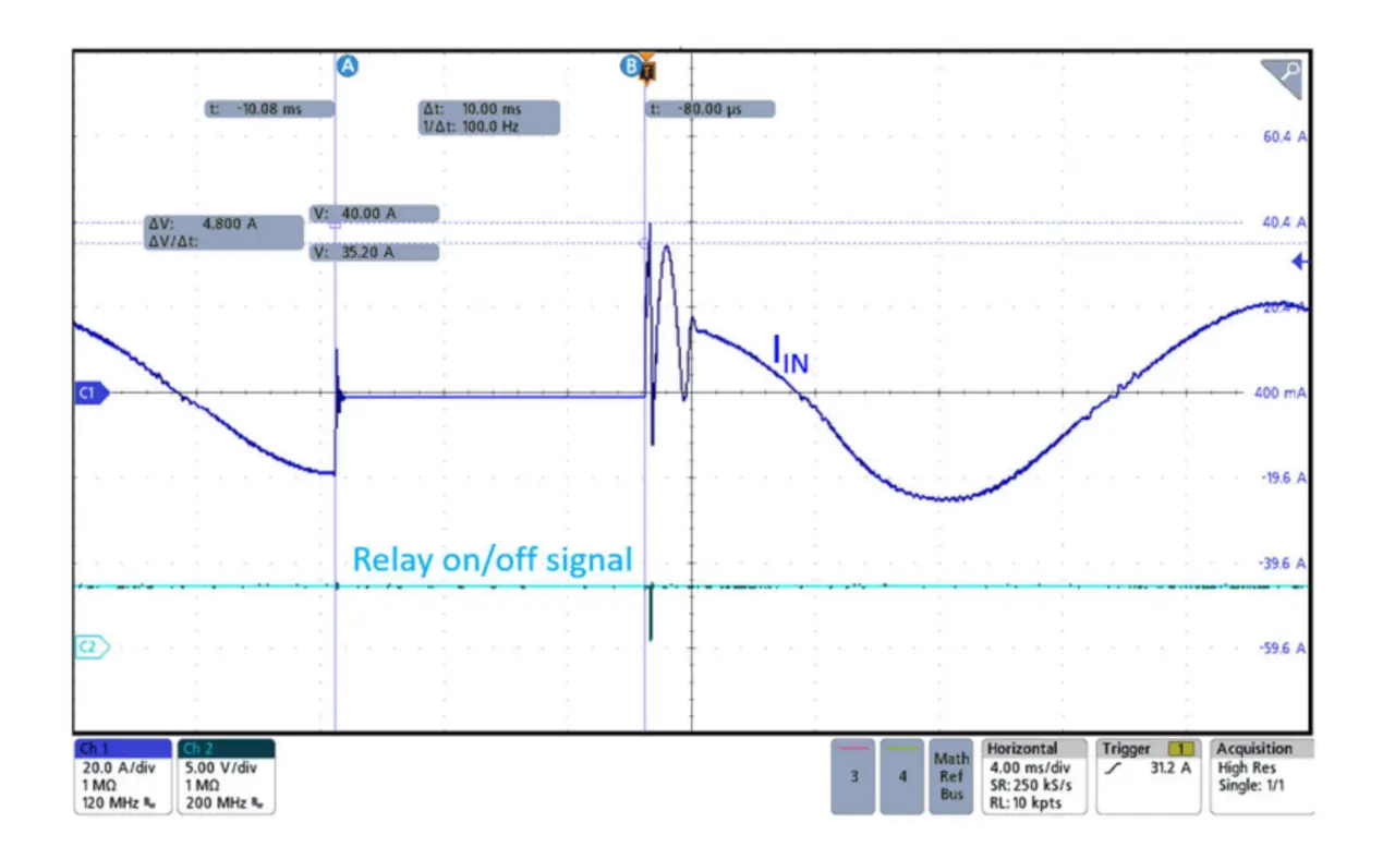 Anders verhält es sich mit dem Rerush-Strom, er tritt während des normalen Betriebs der PFC-Stufe auf. Bild 2 zeigt, wie VAC während des regulären Betriebs der PFC-Stufe plötzlich abfällt. Da die Last weiterhin angeschlossen ist, kann die Ausgangsspannung der PFC-Stufe (VOUT) auf einen iedrigeren Wert abfallen. Kehrt die Netzwechselspannung anschließend wieder zurück, ist VAC höher als VOUT, sodass es erneut zu einem Inrush-Strom kommt, der in diesem Fall jedoch als Rerush-Strom bezeichnet wird.