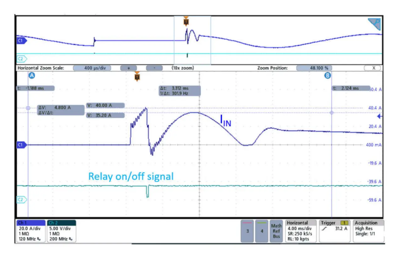 Bild 7 zeigt das Ansteigen des zweiten Rerush-Stroms mit einer begrenzten Steigung infolge der PFC-Eingangsimpedanz. Der Grenzwert von 40 A wird hier nicht überschritten, sodass Q5 nur einmal abschaltet.