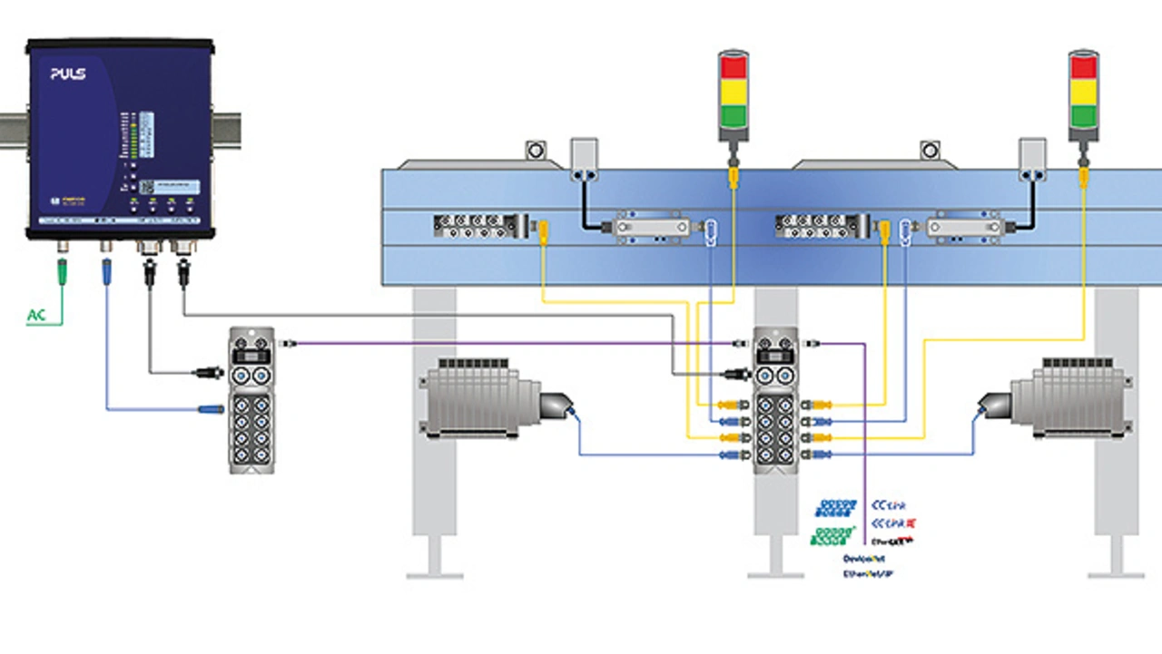 Ein Beispiel aus der Praxis soll den Mehrwert dieser Funktion verdeutlichen. Bild 2 zeigt eine automatisierte Fertigungslinie. Das dreiphasige Fiepos-Netzteil versorgt in diesem Anwendungsfall sowohl Sensoren und Steuerungen, beispielsweise industrielle RFID-Module, mehrere Sensoren, I/O-Master und Signalsäulen sowie die Aktoren (Ventile) mit 24 V. Hierfür wurde die Variante FPT500.245-018-103 mit einer dauerhaften Ausgangsleistung von 600 W und einer kurzzeitigen Spitzenleistung von 1000 W (für bis zu 5 s) gewählt. Als Steckverbinder an den Ausgängen verfügt das Netzteil über zwei vierpolige ⅞-Zoll-Anschlüsse. Die Einbindung in das Kommunikationssystem erfolgt über eine IO-Link-Schnittstelle.