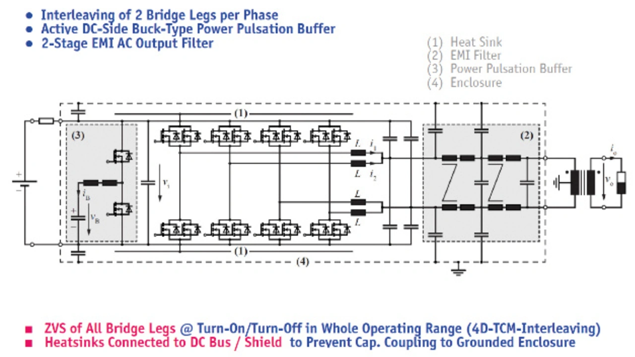 Danach ging es darum, den Umrichter an sich zu entwerfen. Das Rennen bei den Forschern der ETH Zürich machte eine Zero-Voltage-Switching-Topologie mit TCM-Ansteuerung (Triangle Current Mode) und 4D-Interleaving (Bild 2). Dabei werden bis zu zwei Brückenzweige pro Phase ineinander verschachtelt so angesteuert, dass bei kleiner Leistung nur ein Brückenzweig pro Phase moduliert wird. Steigt die Leistung über einen gewissen Level, wird die Last auf zwei parallele Brückenzweige verteilt. Wegen der TCM-Ansteuerung variiert die Schaltfrequenz, in diesem Fall zwischen 250 kHz und 1 MHz.