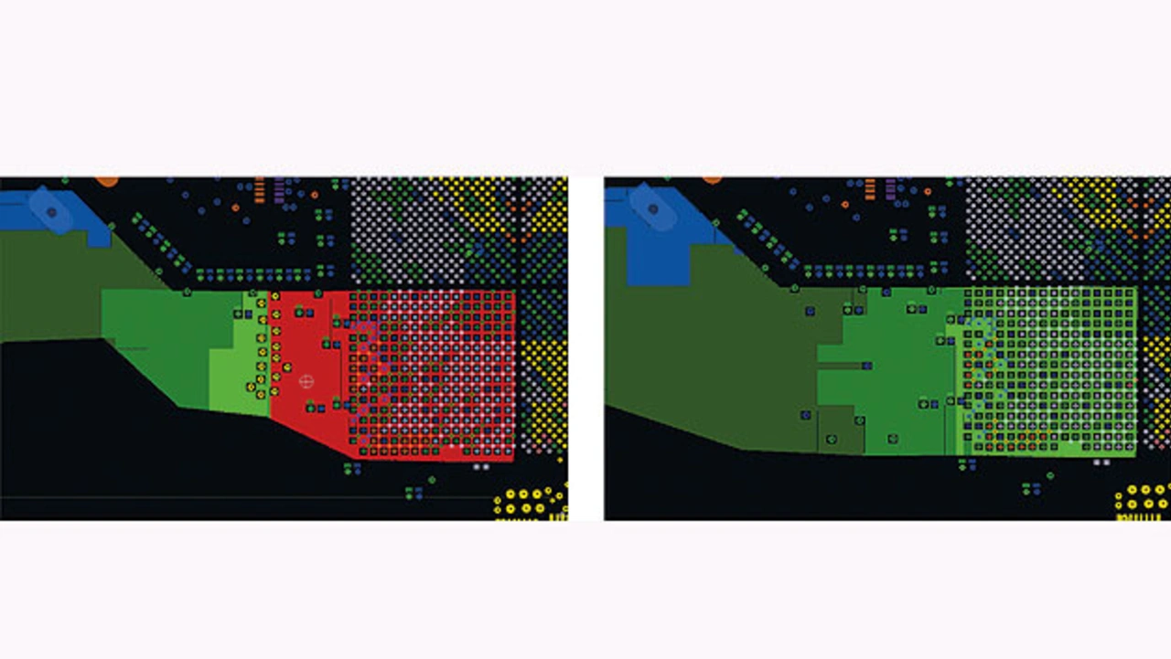 Wie eine Spannungsversorgung im realen Fall aussehen kann, zeigen die beiden Bildschirmfotos aus dem Allegro PCB Designer von Cadence (Bild 1). Das Programm stellt die kritische Spannungsdifferenz farblich auf den Versorgungsleitungen dar und weist den Leiterplatten-Layouter ähnlich einer Rechtschreibkorrektur auf die Problemstelle hin. Mehrere Durchkontaktierungen, die eine Spannungslage auftrennen, verringern den Querschnitt der Fläche und erhöhen damit den Widerstand der Zuleitung. An dieser Stelle fällt die Spannung ab und im weiteren Verlauf der Lage ist die Spannung geringer. Am Widerstand entsteht eine Verlustleistung in Form von Wärme.
