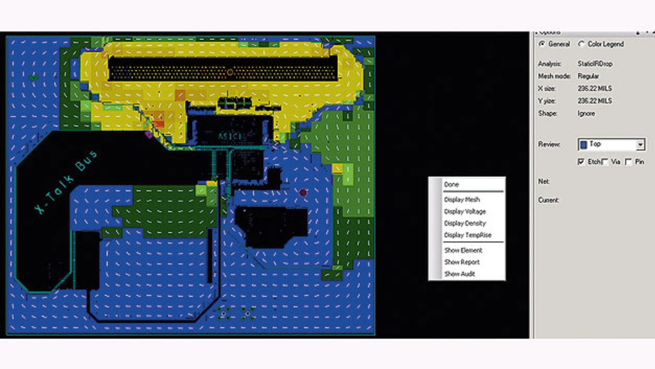 Durch die unglückliche Platzierung von Steckern oder Durchkontaktierungen kann es zu Veränderungen im Leitungsquerschnitt kommen. Der im Bild 2 gezeigte Fall wird von einem geübten Leiterplatten-Layouter auch ohne CAD-Tool erkannt. In komplexeren Schaltungen oder unter Termindruck ist allerdings keineswegs einfach zu erkennen, welche Ströme in welchen Bereichen der Versorgungsflächen fließen und wo es zu kritischen Spannungswerten kommt. Solche kritischen Stellen, oder auch die Summe vieler kleiner Verengungen, lassen sich in einer IR-Drop-Analyse mit der Allegro PCB Design Software erkennen. Die Analyse berücksichtigt die Werte der Versorgungsspannung und der erforderlichen Spannungen für alle Bauteile. Die Zuleitungen vom Netzteil bis zu allen Versorgungsspannungsanschlüssen eines ICs (VCC-Pins) werden untersucht. Dabei werden Werte für die Kupferlagendicke und Verbindungen über Durchkontaktierungen sowie die Stromrichtungen berücksichtigt.