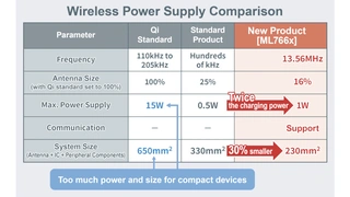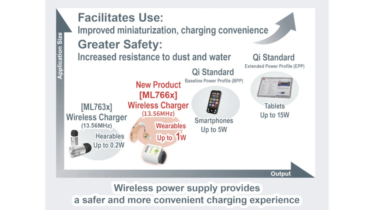 Der Qi-Standard ist zwar weit verbreitet und mit ihm können sogar Leistungen bis zu 15 W übertragen werden, aber die Schaltung mit Induktionsspule ist in der Regel sehr groß. Es lässt sich deshalb nur schwer in Wearables und andere kleine tragbare Geräte integrieren. Das zur Rohm-Gruppe gehörende Unternehmen Lapis Technology hat deshalb die ML763x-ICs entwickelt. Sie nutzen das 13,56-MHz-Frequenzband und ermöglichen eine kontaktlose Leistungsübertragung von 200 mW. Obwohl die ICs vom Markt gut aufgenommen wurden, gab es Forderungen nach mehr Leistung zur Unterstützung von Wearables mit großen Akkukapazitäten. Die neuen ICs ML766x erfüllen diesen Bedarf mit einer Leistung von bis zu 1 W in einen kompakten Gehäuse und erweitert so den Anwendungsbereich.