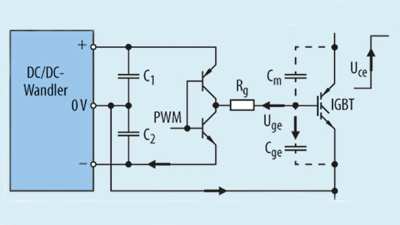 Obwohl diese Induktivität möglicherweise nur gering ist, muss beachtet werden, dass bereits 5 nH eine Spannung von 5 V erzeugen, wenn sich der Strom mit einer Rate (di/dt) von 1000 A/µs ändert, was keineswegs ungewöhnlich ist. Schon eine Leitung von wenigen Millimetern Länge besitzt eine Induktivität von 5 nH. Mit einer hinreichenden negativen Treiber-Spannung lässt sich unter diesen Umständen sicherstellen, dass die Gate-Emitter-Abschaltspannung stets kleiner oder gleich 0 V ist. Die MGJ-Serie stellt hier je nach Variante –5 V, –8,7 V, –10 V oder –15 V zur Verfügung. Eine negative Gate-Treiber-Spannung hilft ebenfalls, die Auswirkungen der zwischen Kollektor und Gate liegenden Miller-Kapazität zu beherrschen. Diese injiziert einen Strom in die Gate-Treiber-Schaltung, wenn der Schalter sperrt. Wenn beispielsweise ein IGBT aufgrund eines entsprechenden Treibersignals sperrt, so steigt seine Kollektor-Gate-Spannung und ein Strom der Höhe Cm ∙ dUce/dt fließt durch die Miller-Kapazität in die Gate-Emitter-Kapazität Cge und durch den Gate-Widerstand in die Treiber-Schaltung (Bild 2). Die infolgedessen am Gate entstehende Spannung Uge kann bereits ausreichen, um den IGBT wieder einzuschalten, was zu einem Shoot-Through-Strom führen und Schäden verursachen kann. Dieser Effekt lässt sich vermeiden, wenn man das Gate mit einer negativen Spannung ansteuert. Das beschriebene Phänomen tritt auch bei allen Arten von MOSFETs auf.