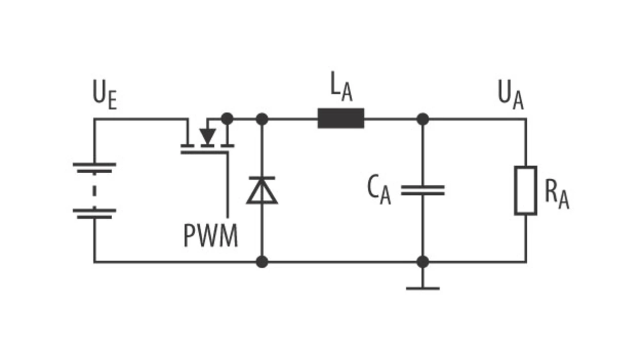 Der in Bild 3 vereinfacht dargestellte Abwärtswandler dient zur Veranschaulichung der stromgeführten Spitzenwertregelung. Die Vorgehensweise kann jedoch auch bei anderen Schaltungen angewendet werden. Um eine stabil arbeitende Kompensationsschaltung zu entwerfen, wird zuerst ein mathematisches Modell der Abwärtswandlerschaltung benötigt. Gemäß [1] kann eine Abwärtswandlerschaltung mit drei Termen beschrieben werden, nämlich