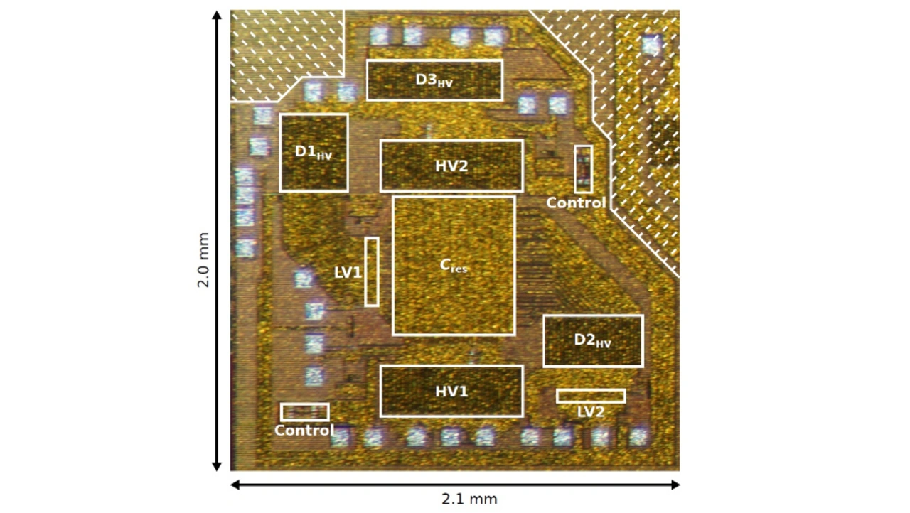 Der 2,0 mm × 2,1 mm große Chip wurde bei X-Fab in einer CMOS-SOI-Technologie (Silicon on Insulator) mit 0,18 µm Strukturbreite gefertigt (Bild 4). Um die hohe Sperrspannung der Schaltelemente in vertikaler Richtung zu erreichen, wird in dieser Technologie ein in Sperrrichtung vorgespannter p-n-Übergang genutzt, welcher das Substrat unterhalb des vergrabenen Oxids (Buried Oxide, BOX) der Hochspannungsbauelemente verarmt [9]. Parasitäre Effekte wie bipolare Effekte und Leckströme sind in SOI vernachlässigbar. Dies vereinfacht das Design und verbessert den Wirkungsgrad. Allerdings stellen Verluste durch parasitäre Kapazitäten (z.B. zwischen Drain und Source sowie zum Substrat hin) bei schnell schaltenden Hochspannungswandlern für Anwendungen mit geringer Leistung eine Herausforderung dar.