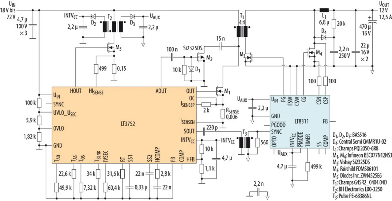 Bild 1 zeigt einen 150-W-Flusswandler ohne Optokoppler. Möglich wird das durch die programmierbare Voltsekunden-Klemmung des LT3752. Für einen Flusswandler, der mit kontinuierlichem Strom (Continuous Conduction Mode; CCM) arbeitet, ist die Ausgangsspannung UOUT = UIN · N · D, mit UIN als Eingangsspannung, N ist das Windungsverhältnis sekundär zu primär und D der Arbeitszyklus. Die Klemmung des Arbeitszyklus am OUT-Pin von LT3752, LT3752-1 und LT3753 folgt UIN invers, um eine konstante Ausgangsspannung UOUT über den Eingangsspannungsbereich zu erhalten.