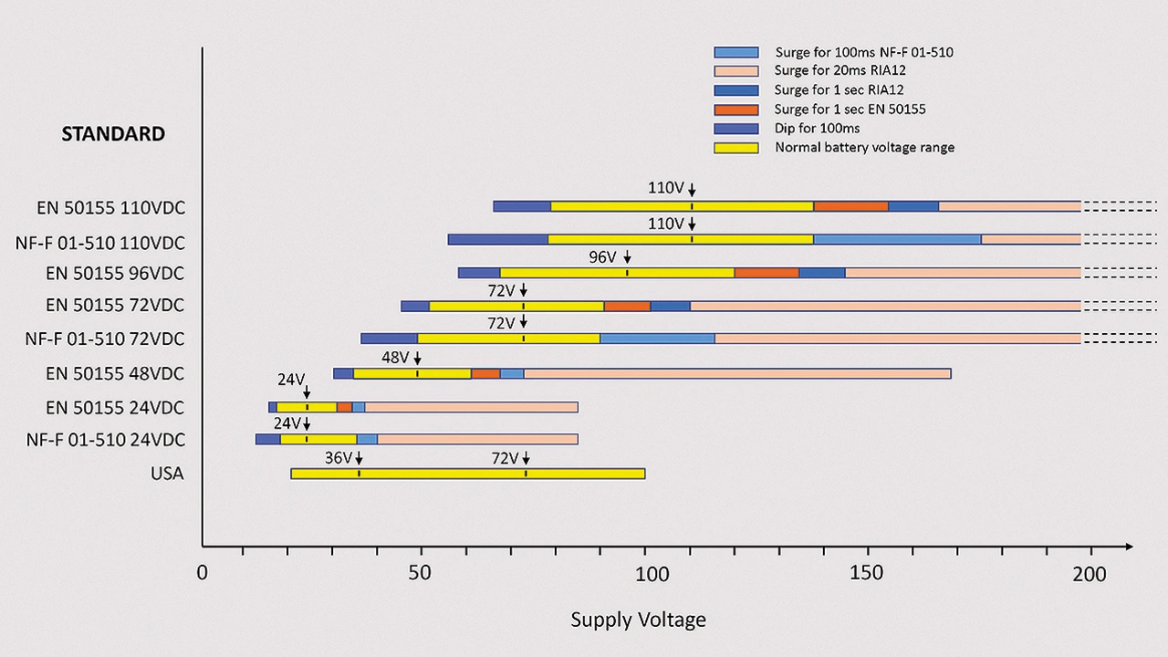 In der Vergangenheit gab es bei Schienenfahrzeugen auf allen Märkten mehrere Nennwerte für die Gleichspannung der Systembatterie von 24 V bis 110 V, wobei die Abweichungen und Toleranzen auch von der geografischen Lage abhängen. Die europäische Norm EN 50155 ist weit verbreitet, ebenso wie die französische Norm NF-F 01-510, die einige Abweichungen aufweist, während ältere Normen wie die aus dem Vereinigten Königreich stammende RIA12 weiter bestehen. In den USA sind die Toleranzen für die Systemspannungen 24 V und 72 V wiederum unterschiedlich. Bild 1 zeigt eine Auswahl der beobachteten Nennspannungen, ihre statischen Toleranzen sowie die dynamischen Einbrüche und Überspannungen.
